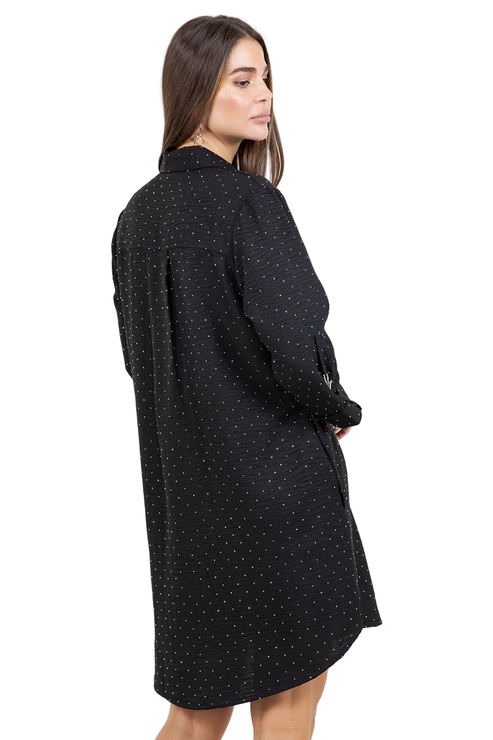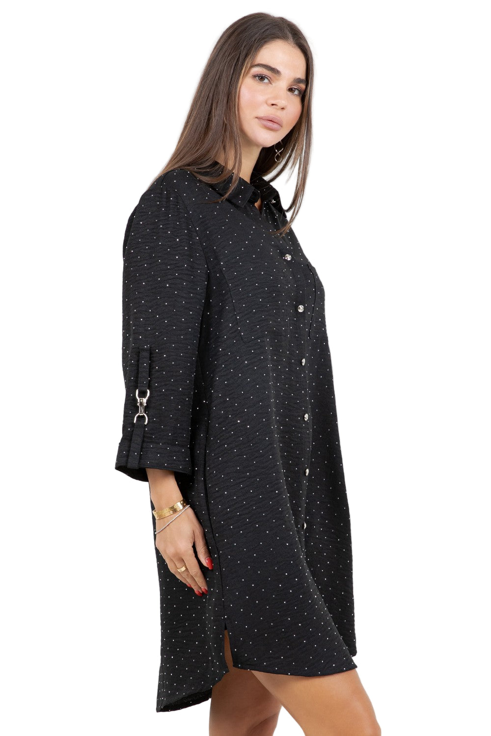 Button-down, collar dress with 3/4 sleeves detailed with metal clips. Features pockets.